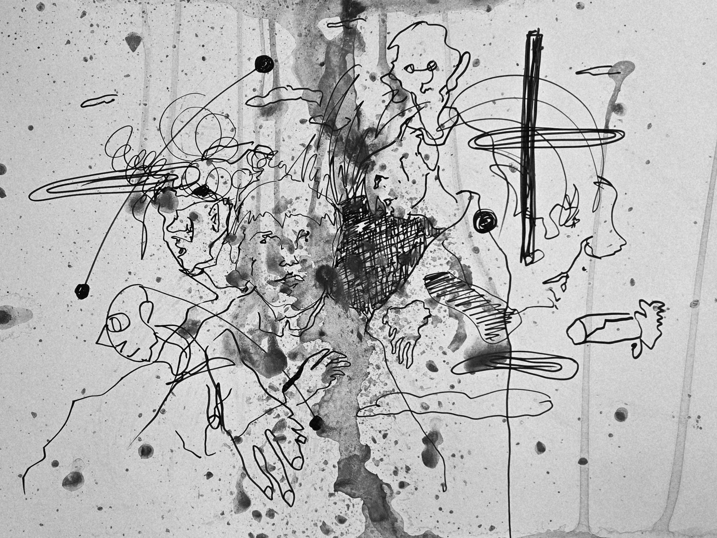 A person holding an eraser and drawing on paper with black ink. The artwork includes abstract lines, sketches of faces, and splattered ink.